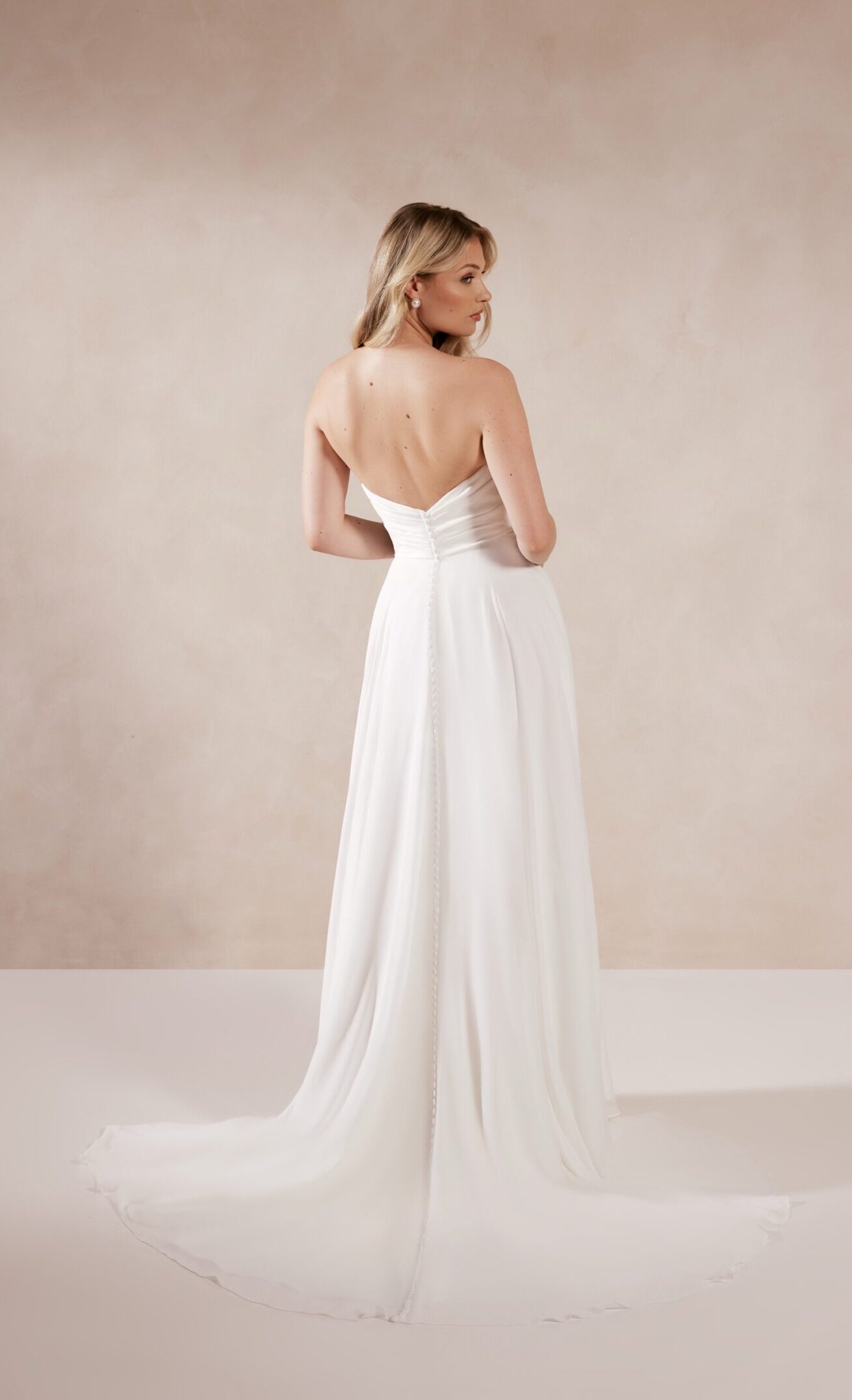 En de achterkant? Een echte showstopper! De fijne knoopjes lopen van de rug helemaal door over de sleep – een droomdetail dat jouw silhouet extra elegant maakt.