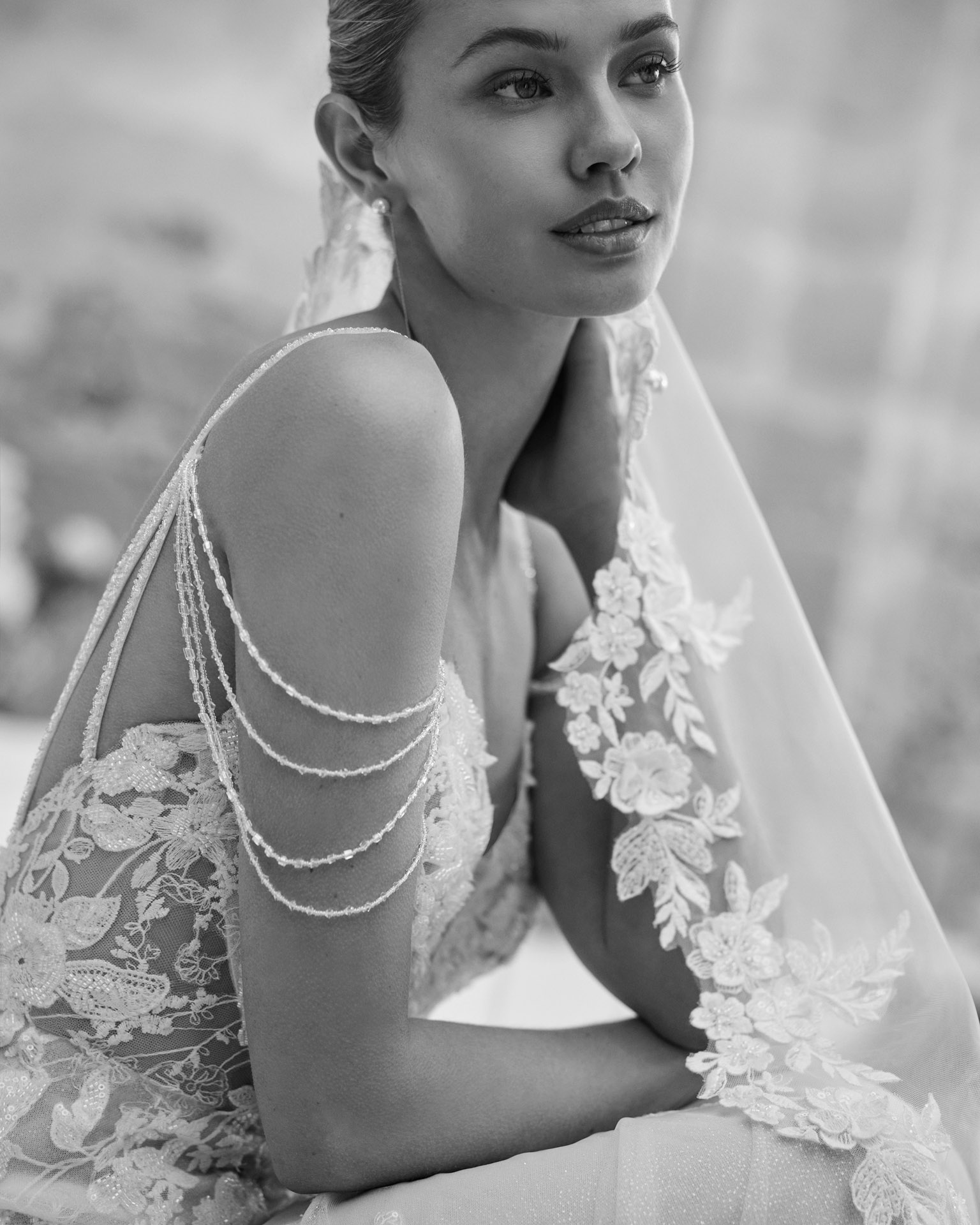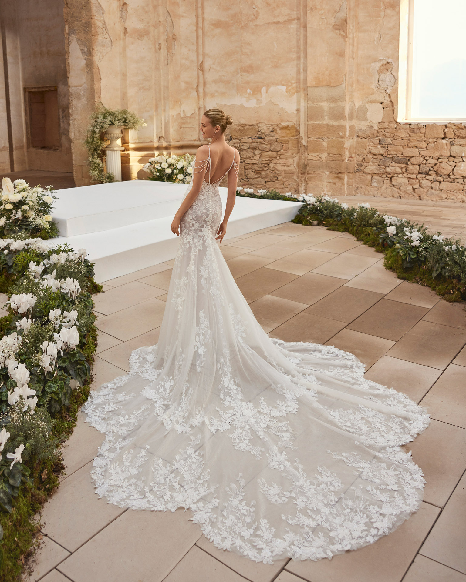 Stralend, sensueel en onweerstaanbaar: Marisela is de bruidsjurk waarin je de show steelt zonder ooit te overdrijven. Met haar verfijnde mermaid-silhouet vormt ze je vormen als een tweede huid, accentueert ze je taille en laat ze je naar het altaar schitteren. Het kantwerk met pareltjes schitteren in het zonlicht, terwijl de verleidelijk open rug, de subtiele beaded bandjes én de indrukwekkende sleep je rondingen in de spotlight zetten. De sweetheart-halslijn omhult je decolleté als een zachte omhelzing en — vrouwelijk en toch krachtig. 😍