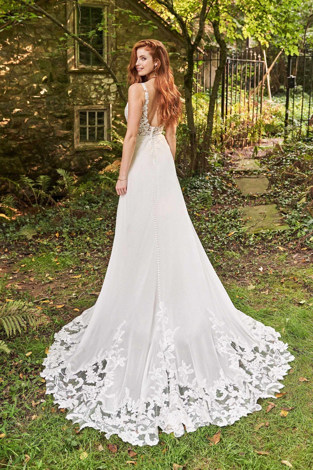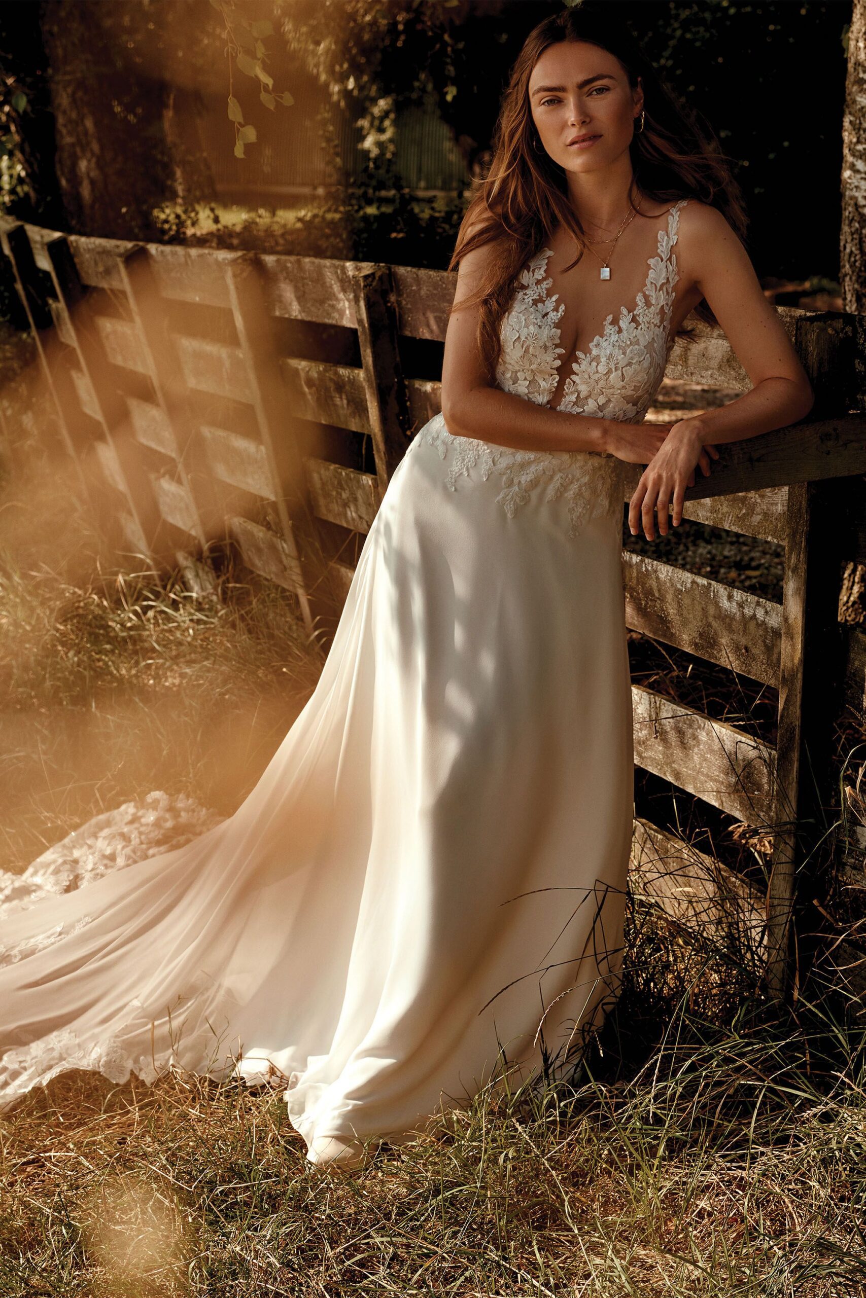 Zó romantisch!  In deze prachtige A-lijn bruidsjurk van Lillian West zal je stralen als bruid! ✨ Deze trouwjurk heeft een diepe tule decolleté met een mooie ondertoon die perfect past bij je huid, waardoor de kanten applicaties langs de halslijn tot aan de bandjes lijken te zweven.  Met een onderlaag van Chantilly-kant in het doorschijnende lijfje en kant die overgaan op de zwierige rok van chiffon. Met een sexy V-rug en knoopjes die naar beneden lopen tot het einde van de sleep.